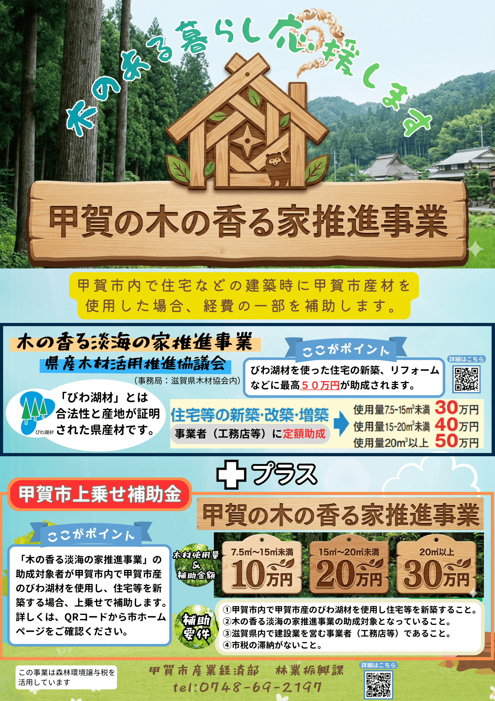 - 甲賀市内で住宅等を新築し、県産木材活用推進協議会が実施する「木の香る淡海の家推進事業」の助成対象になっていること(滋賀県内で建築業を営む事業者(工務店等))